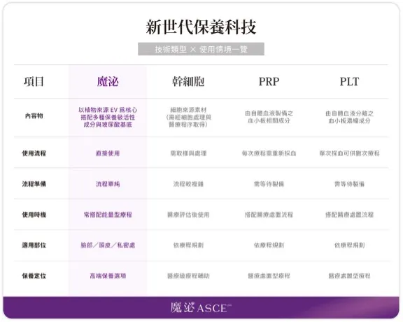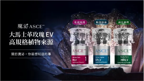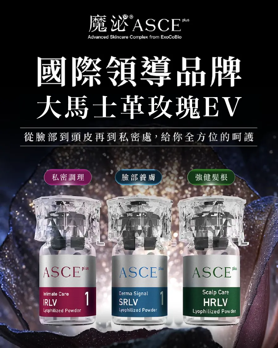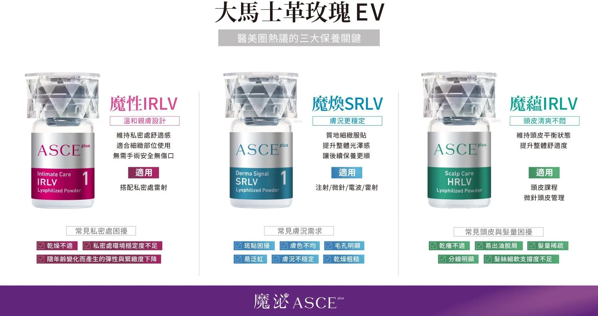 ASCEplus 魔泌了解不同部位的肌膚有不同的需求,因此開發了針對臉部、頭皮和私密處的專屬EV精華,提供更精準有效的保養方案。