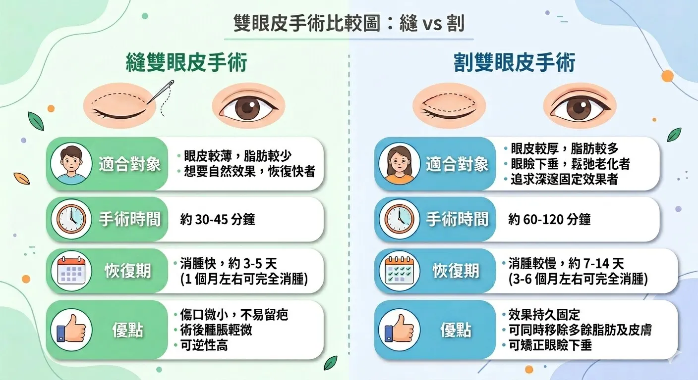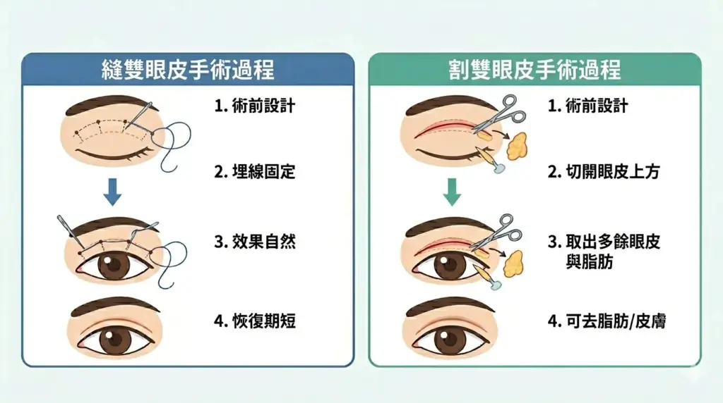 雙眼皮手術是透過 縫/割 的技術,在上眼皮形成自然摺痕,讓眼睛看起來更有神、放大且立體。但很多人其實不知道縫雙眼皮和割雙眼皮的差異在哪裡。