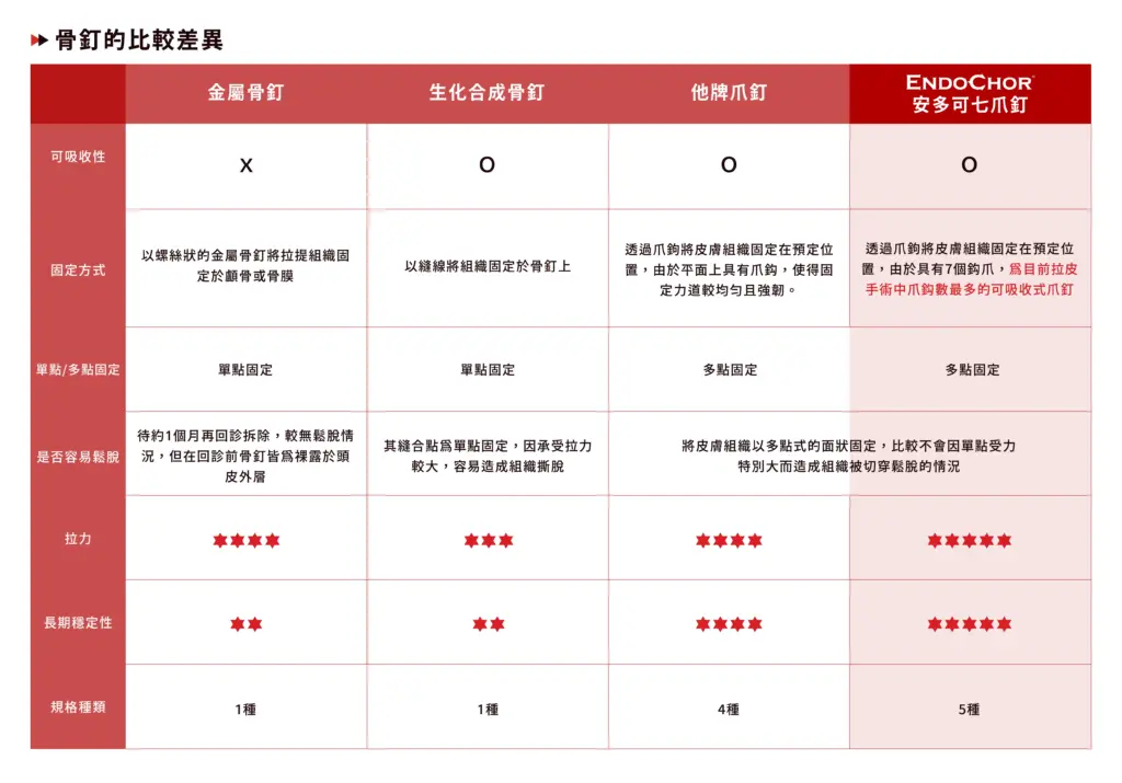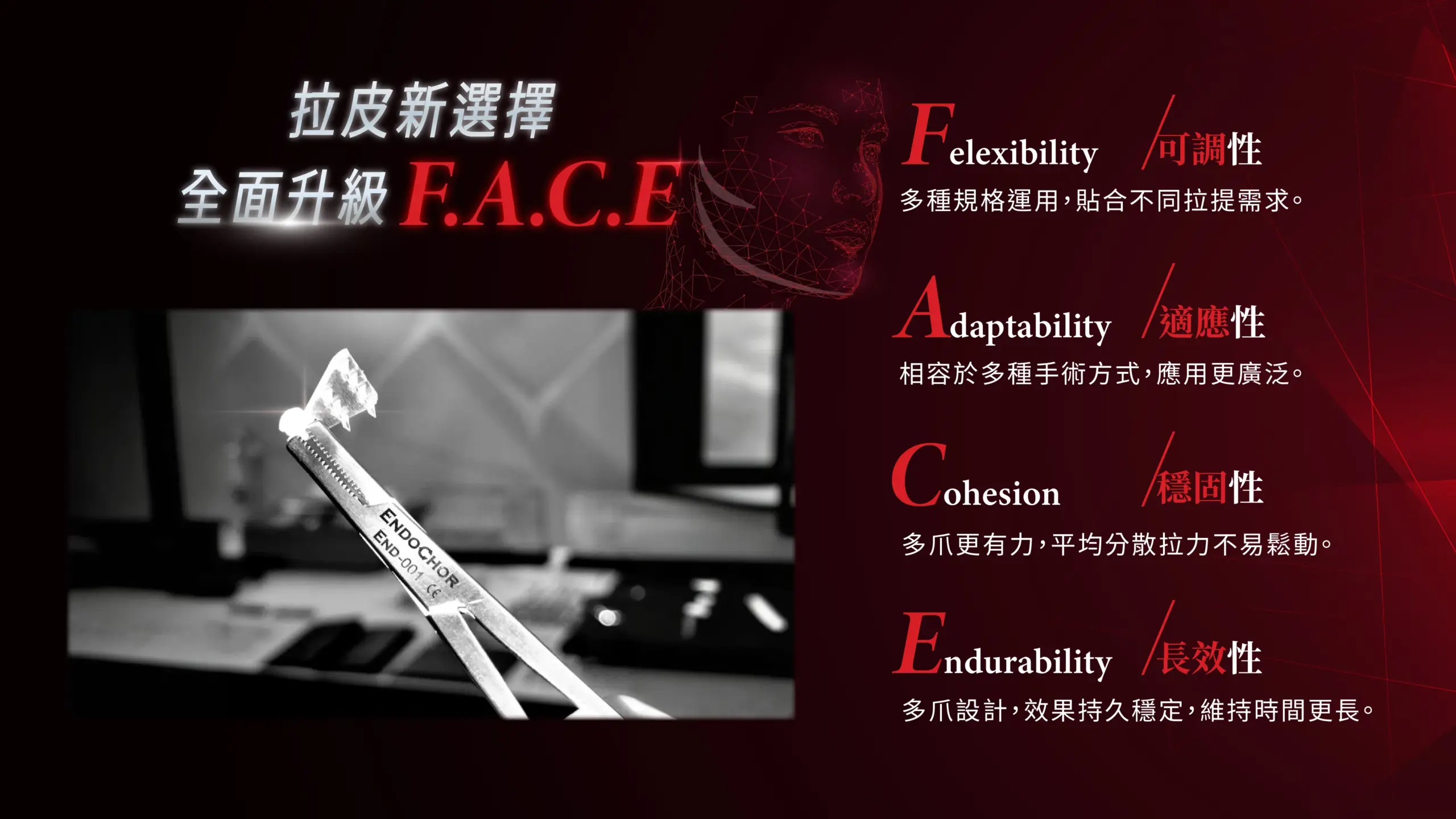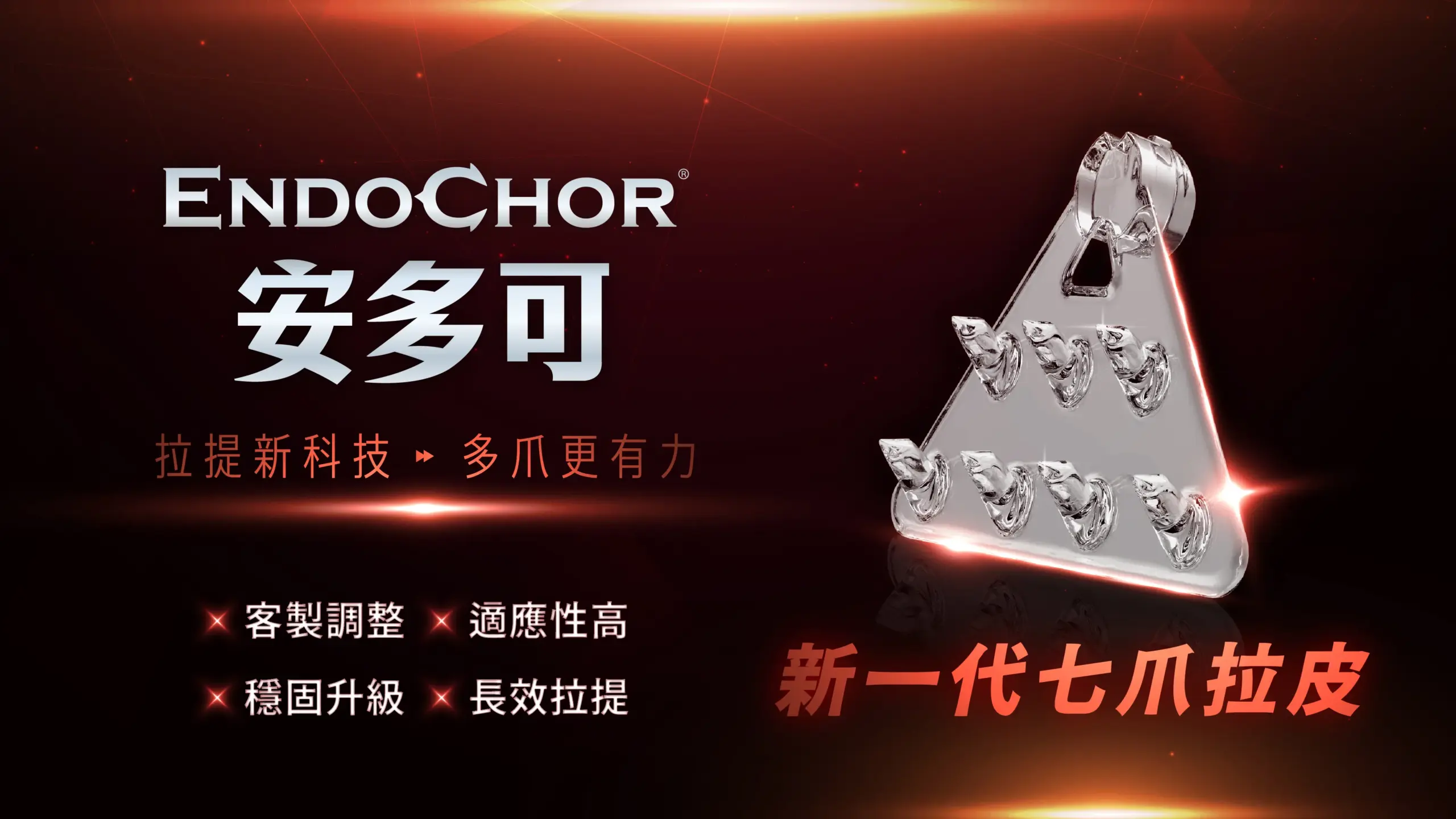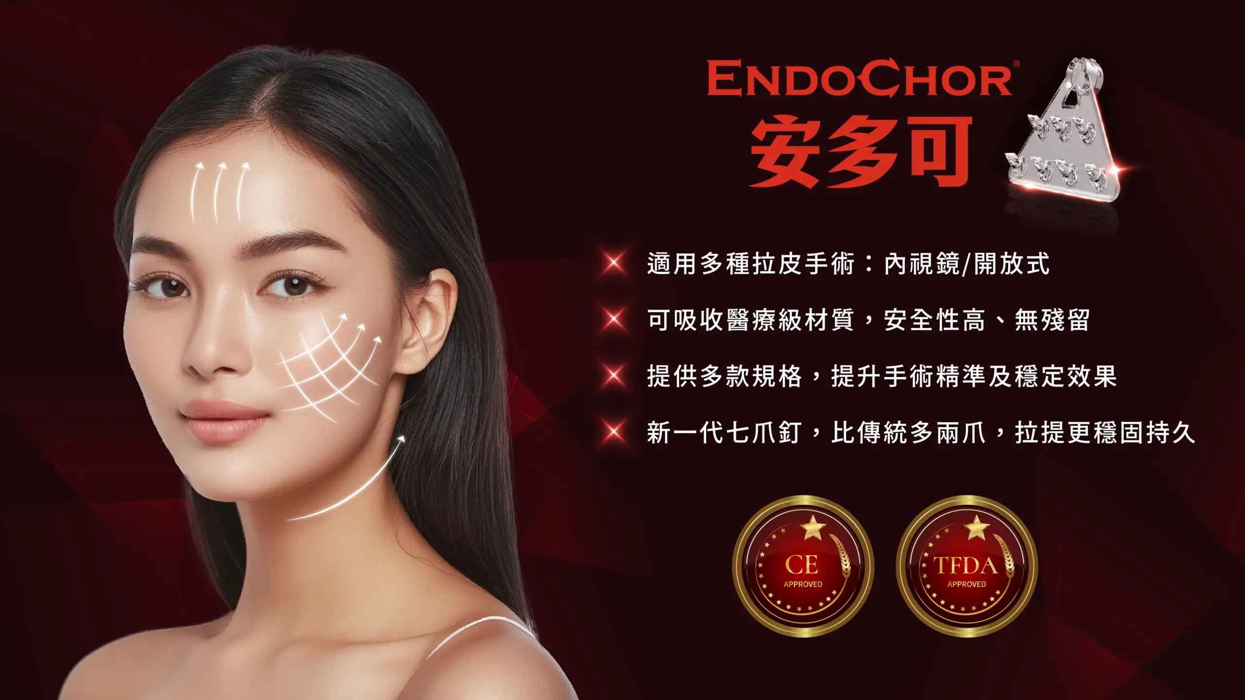 EndoChor®安多可是一款通過歐盟CE認證的臉部拉皮固定系統。結合獨家Multi-Vectoral Technology (MVT) 技術,採用可吸收材質與多爪結構,多點分立、單片穩定支撐,讓組織固定更自然、更穩定。