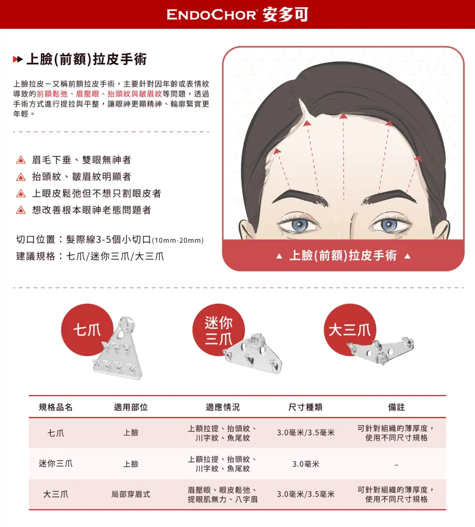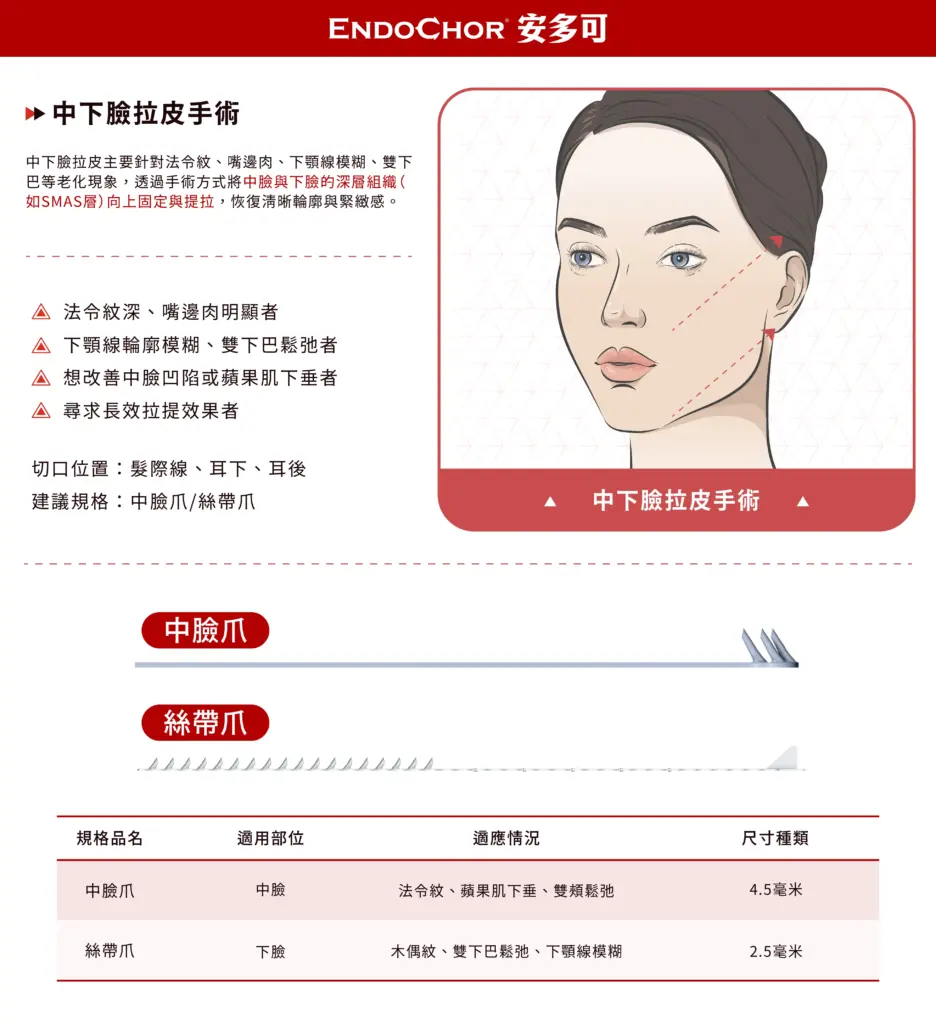 EndoChor 安多可是一種醫療級可吸收多點固定器,主要用於內視鏡拉皮手術中固定提拉後的 SMAS 筋膜層。