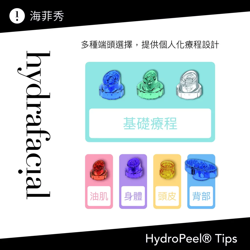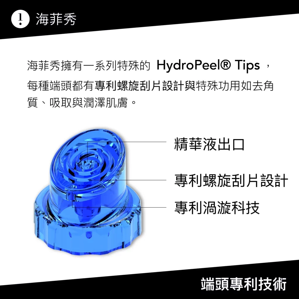 海飛秀擁有一系列的Hydropeel ® 端頭,每種端頭都有專利螺旋刮片設計與特殊功用,如去角質、吸取與潤澤肌膚。