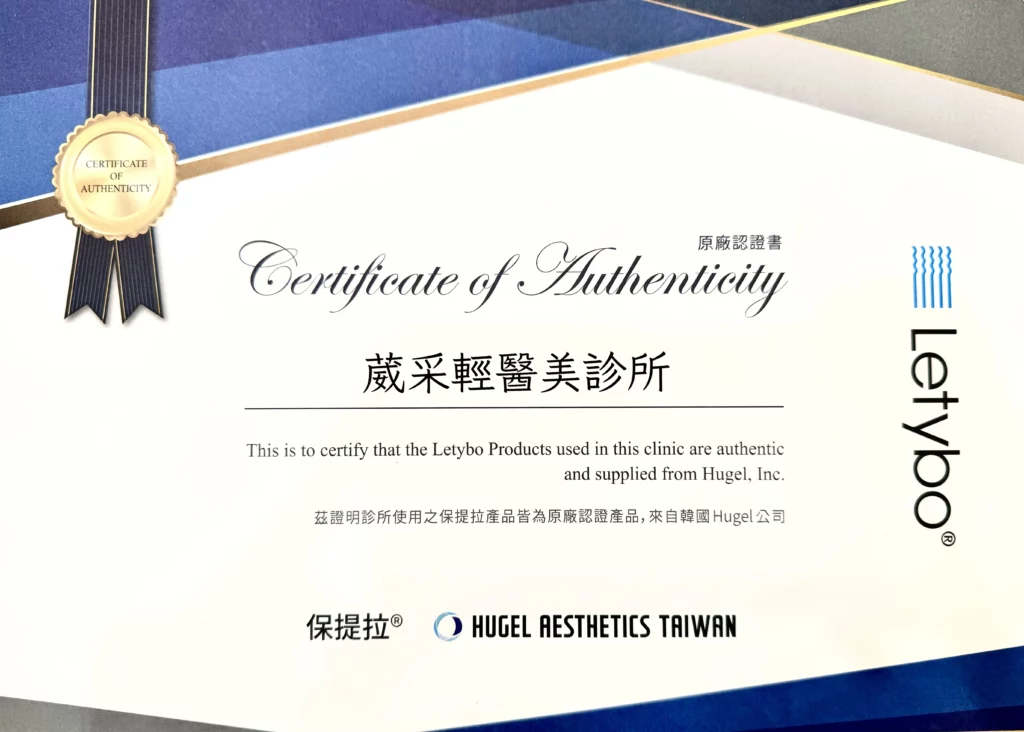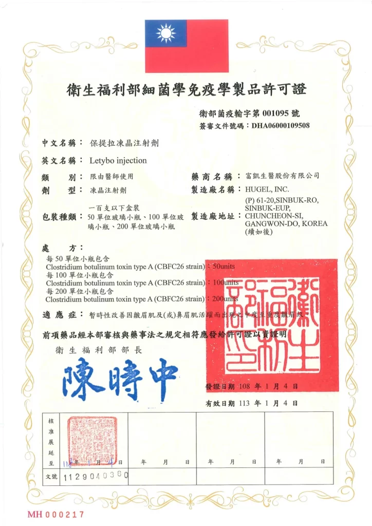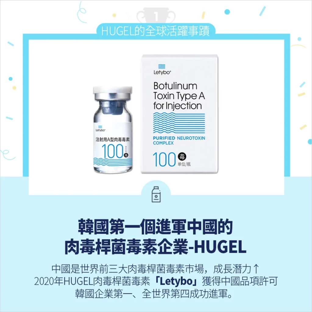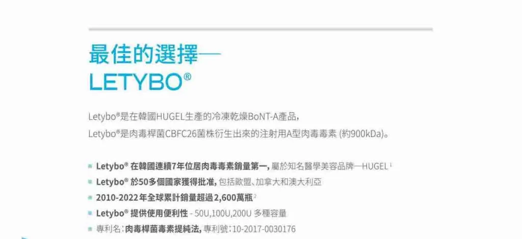 Letybo保提拉肉毒採取Hugel製藥公司專利提純法,產製的900kD蛋白純度達到99.5%,不但含量高於韓國食藥署標準
