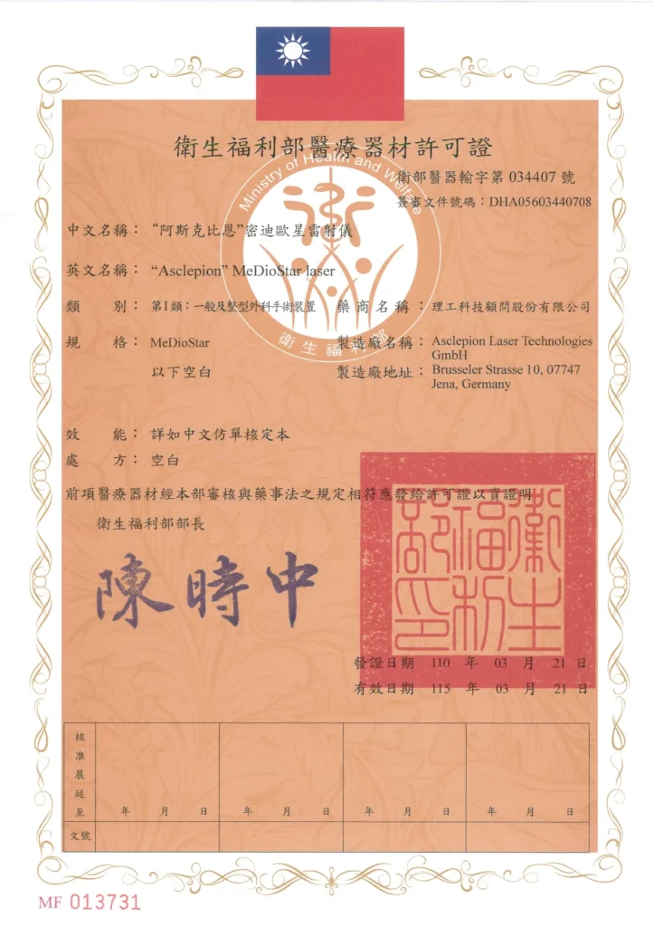 密迪歐星迷彩緹雷射儀通過美國FDA,歐盟CE以及台灣衛福部三項全能認證。