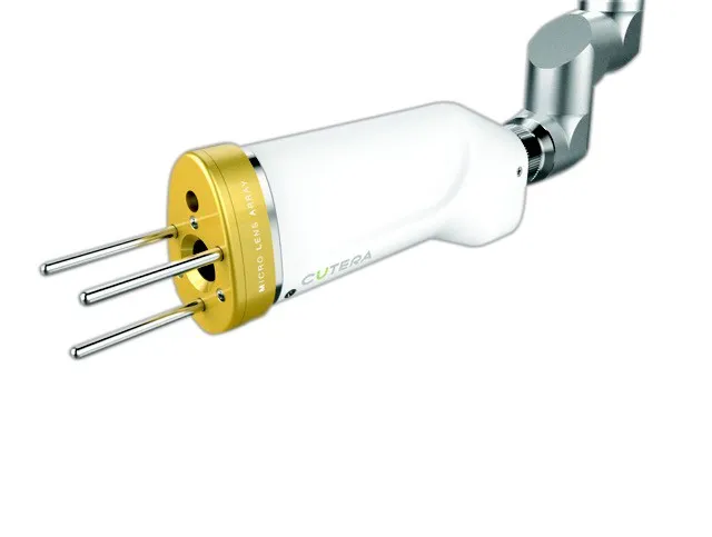 探頭前套上黃金透鏡(MLA微透鏡陣列),聚焦雷射能量深入真皮層,在不破壞表皮層的情況下,將雷射能量集中、放大,將能量聚焦穿透至真皮層,每個雷射點約可產生200個聚焦點,啟動自動組織修復機制,同時刺激膠原蛋白與彈性纖維增生,產生可以改善痘疤的空泡效應,達到皮膚年輕緊緻效果。
