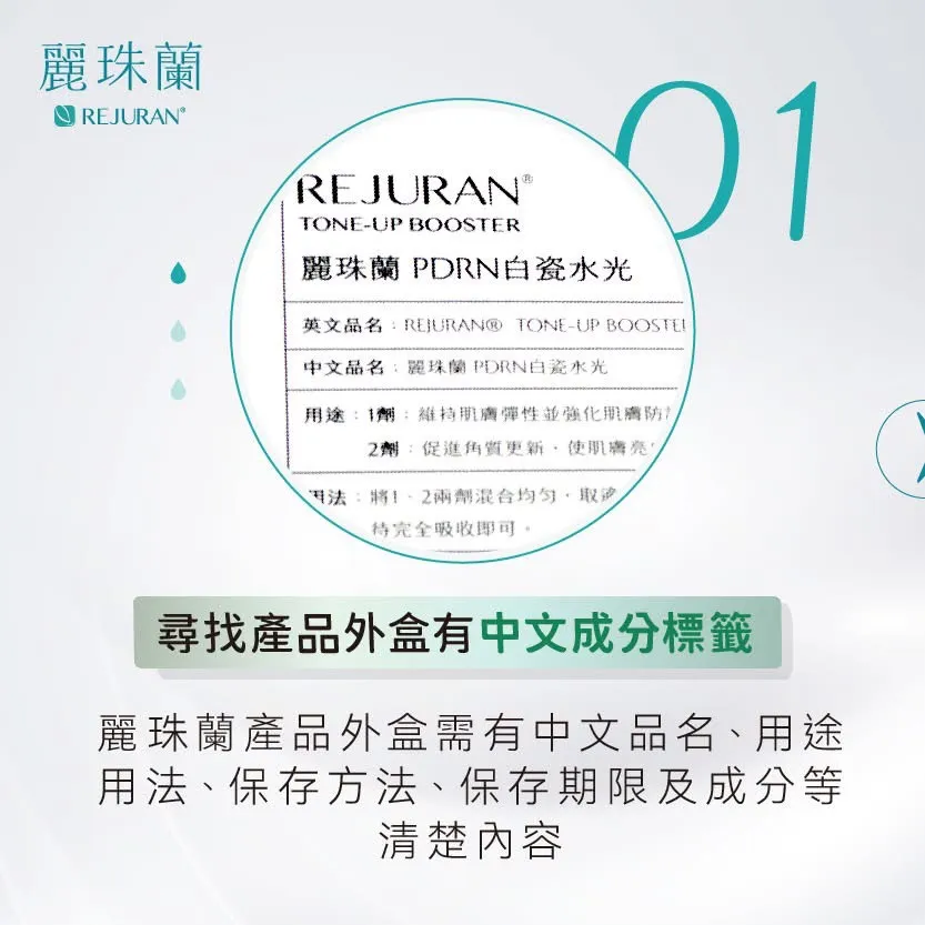 目前台灣上市的非注射針劑,而是塗抹用的麗珠蘭 PDRN修復水光SKIN BOOSTER與PDRN白瓷水光 TONE-UP BOOSTER,適合搭配微針電波、音波、REEPOT等光電雷射合併治療使用。