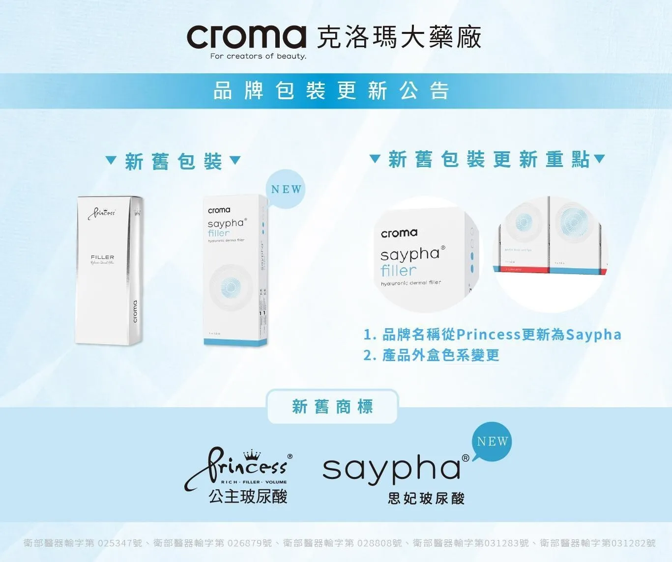 Princess 公主玻尿酸在台上市近十年,品質安全穩定,深受許多愛美人士推崇與喜愛。為提供更進步且優化的產品體驗,奧地利原製造廠“克洛瑪大藥廠”近年開始 在全球推動品牌包裝變更,全面更新為“思妃玻尿酸 Saypha® Hyaluronic Acid”。純化技術升級而主要成分不變,仍維持過往公主玻尿酸之低致敏率與高安全性。