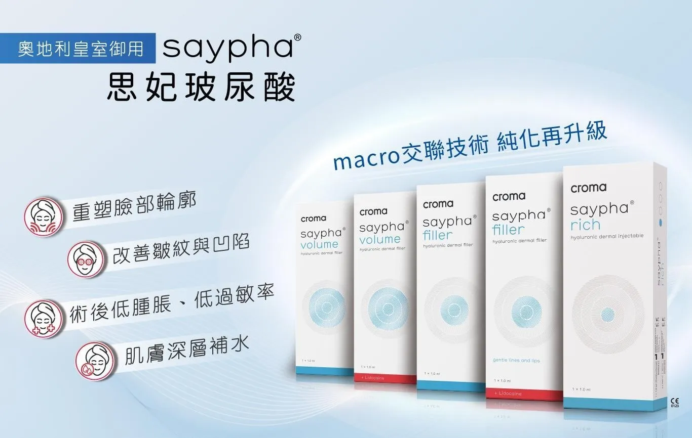 來自奧地利皇室御用品牌「croma 克洛瑪大藥廠」的 saypha 思妃玻尿酸,100% 歐洲製造原裝進口,以其嚴謹製程與高標準要求,確保思妃玻尿酸的高規生產品質, 讓患者在治療時能更安心。