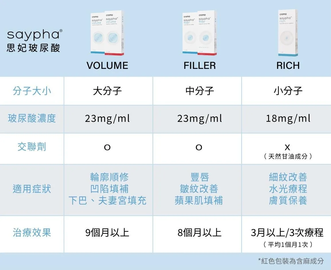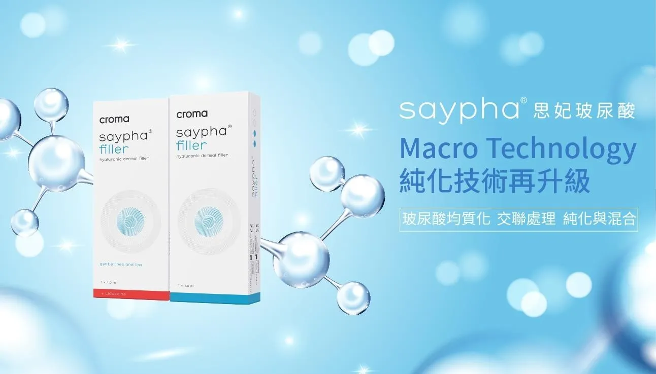 市面上的玻尿酸品牌百百種,每一種都有不同的劑型特色與價格定位。來自奧地利 的 Saypha 思妃玻尿酸,以其卓越品質與創新科技脫穎而出。與在台灣已上市多年的 Princess 公主玻尿酸皆來自 croma 克洛瑪大藥廠,除了保留過往公主玻尿酸的優勢外,思妃玻尿酸的製程,透過macro 純化技術再升級,同時兼顧膠體柔軟自然、不外擴位移與術後低腫脹、低修復期等優勢。