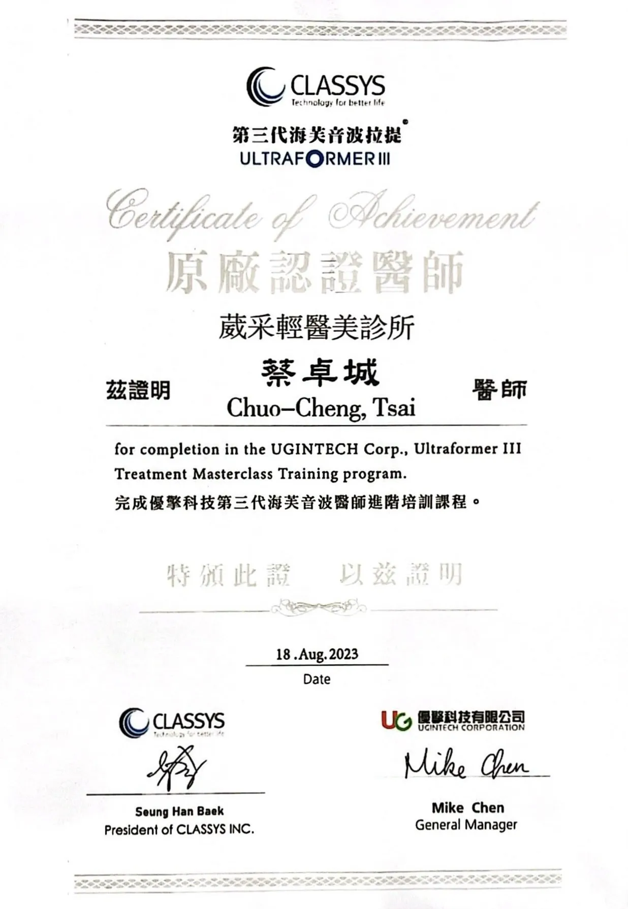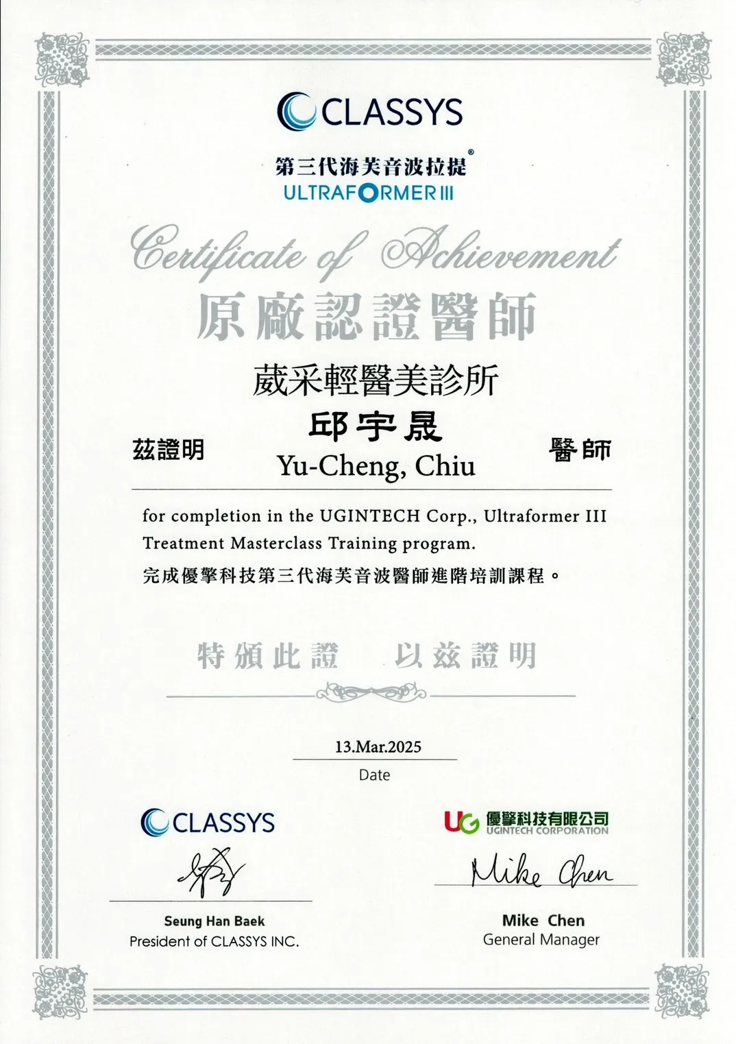 Ultraformer lll 第三代海芙音波醫師講師認證