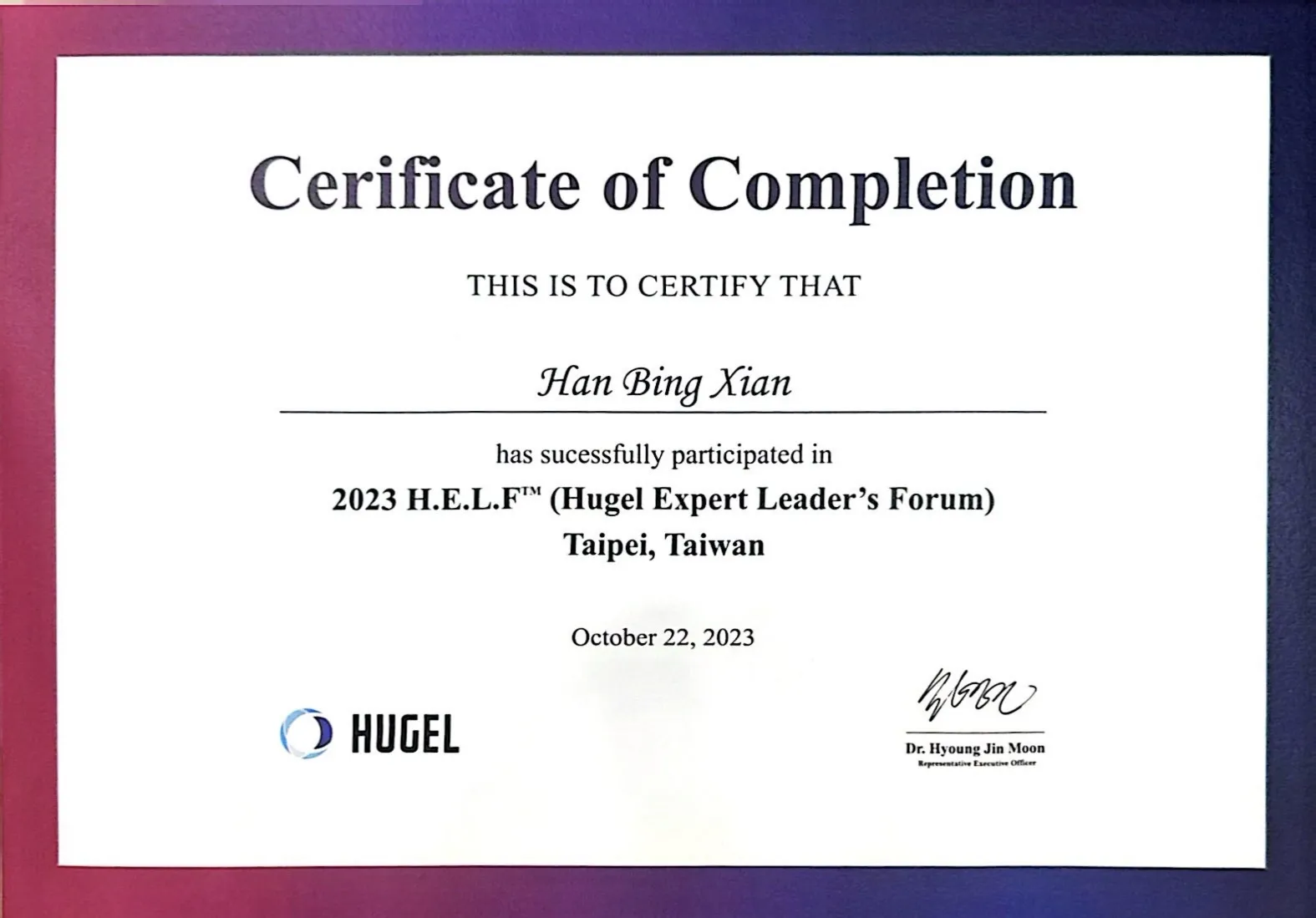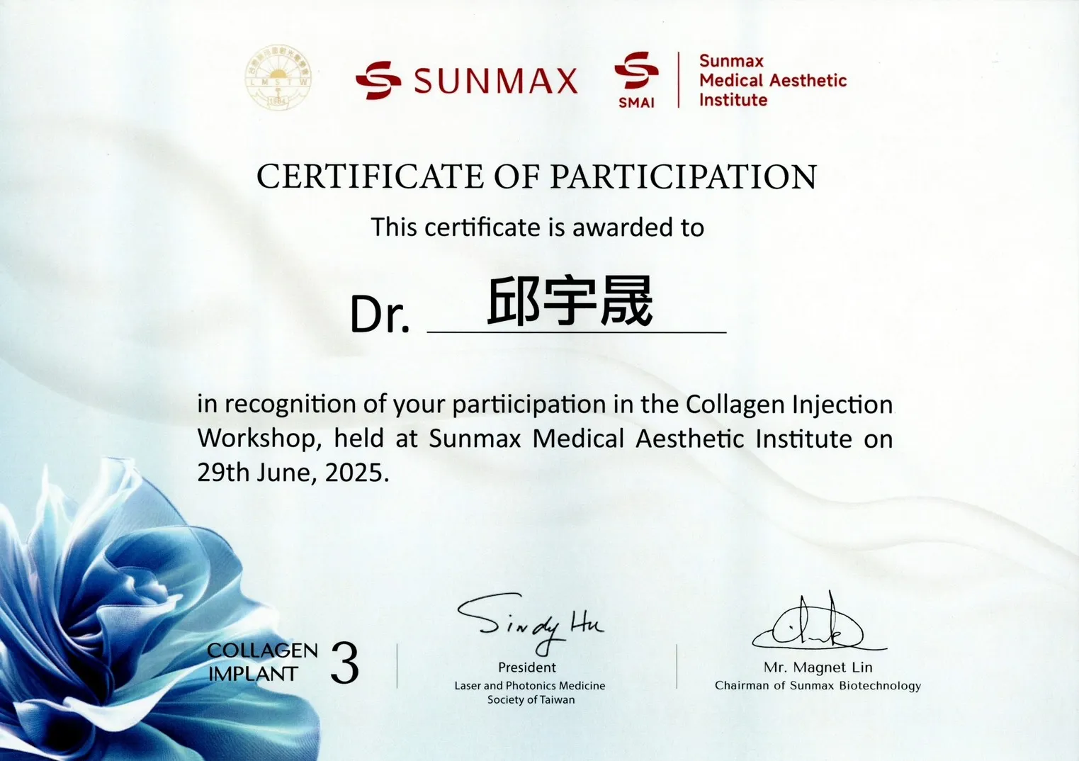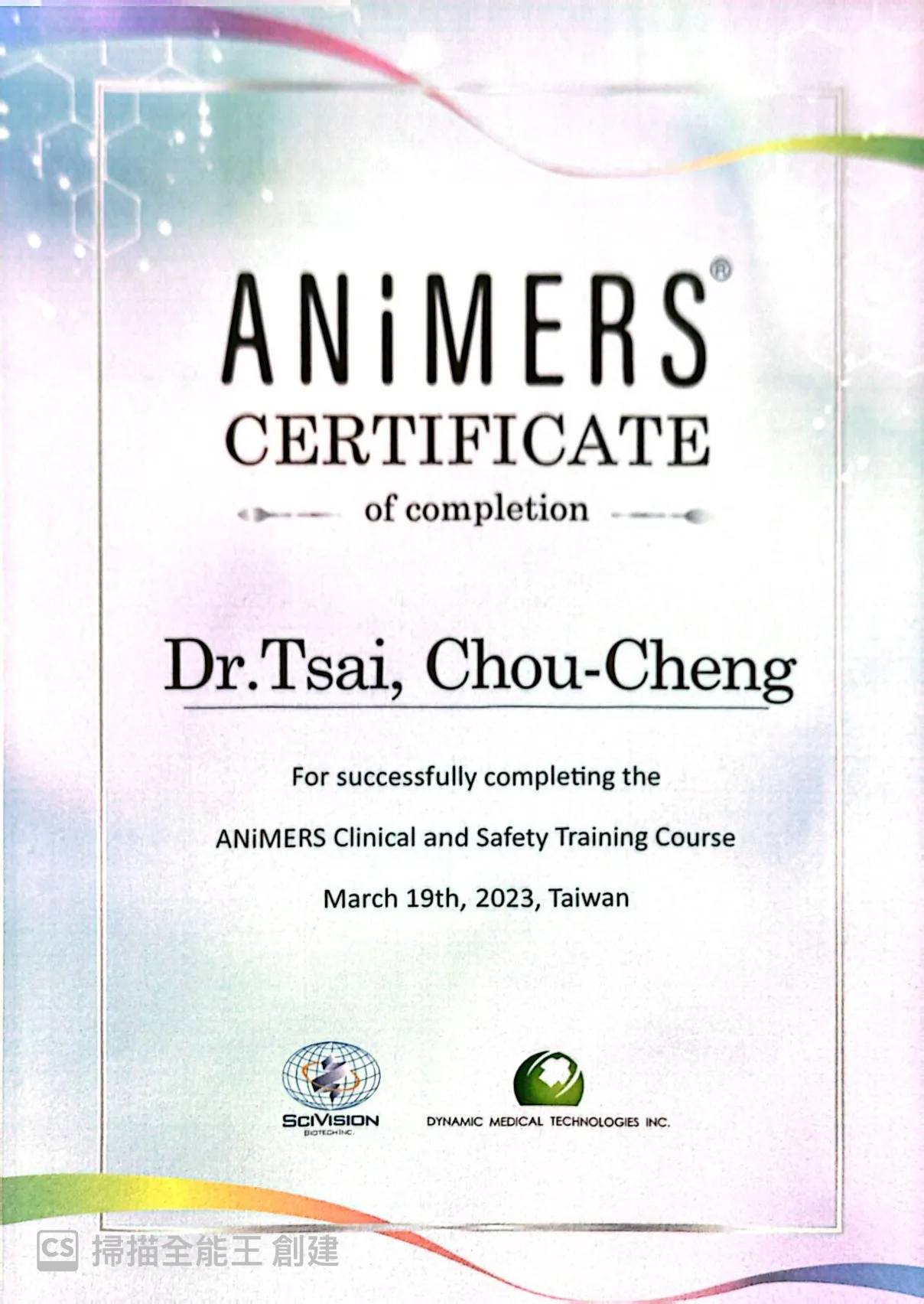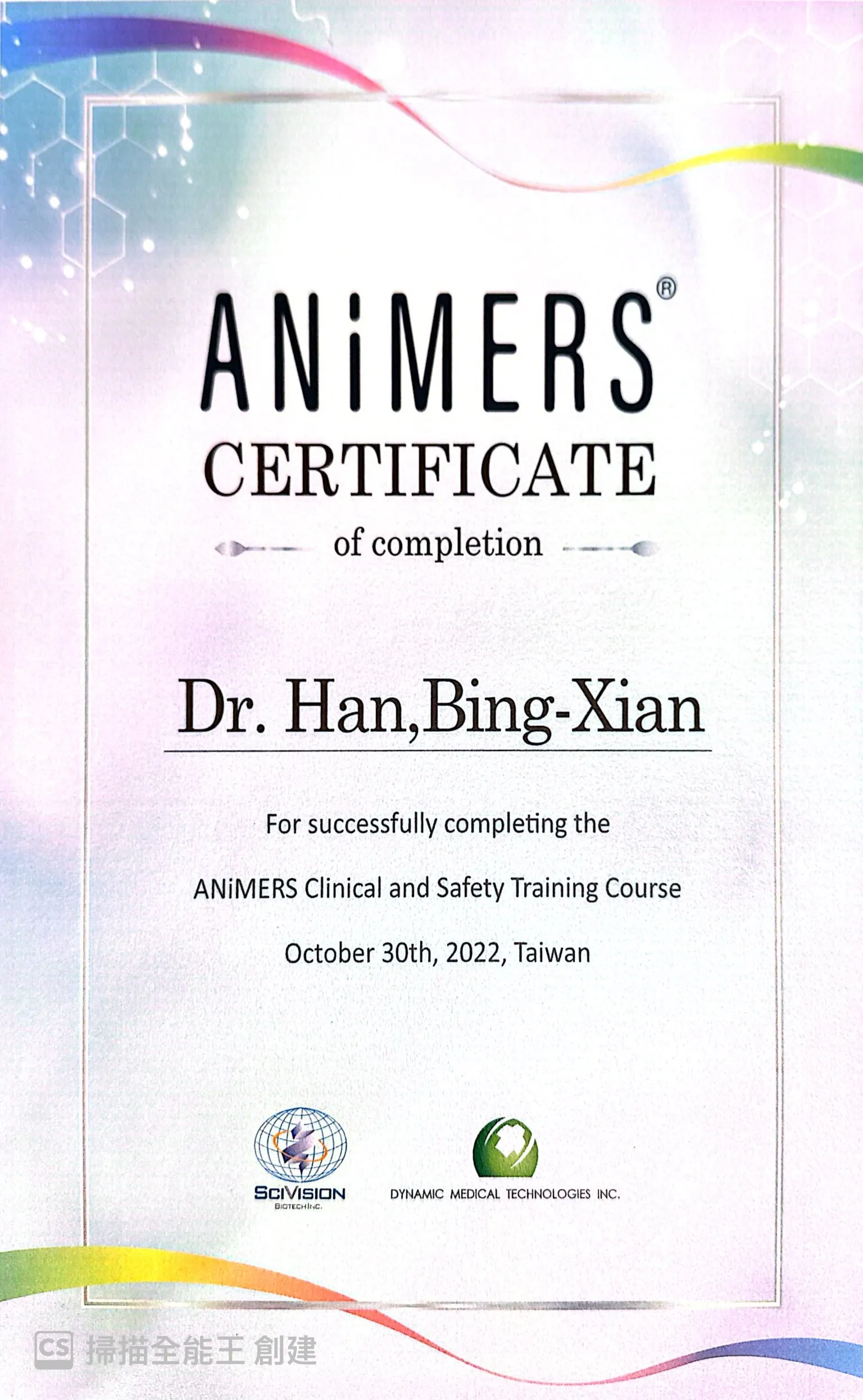 Animers愛霓密絲玻尿酸培訓證書